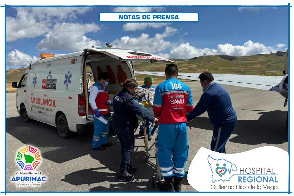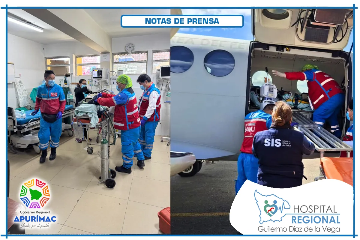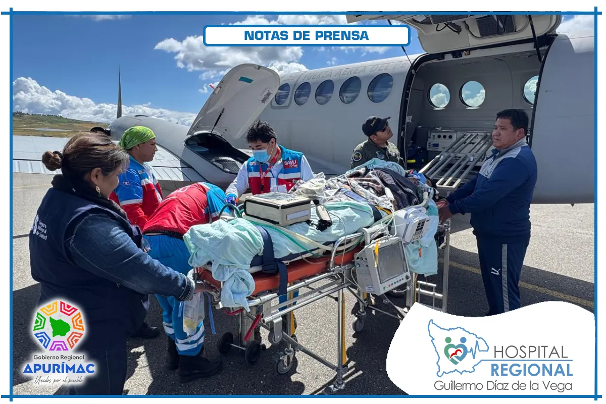 En una muestra de eficiencia y compromiso, el equipo médico del Hospital Regional Guillermo Díaz de la Vega logró concretar el traslado aéreo de un paciente crítico de 15 años con diagnóstico de Traumatismo Encéfalo Craneano desde Abancay hasta el Instituto Nacional del Niño de San Borja en Lima, para recibir atención especializada.