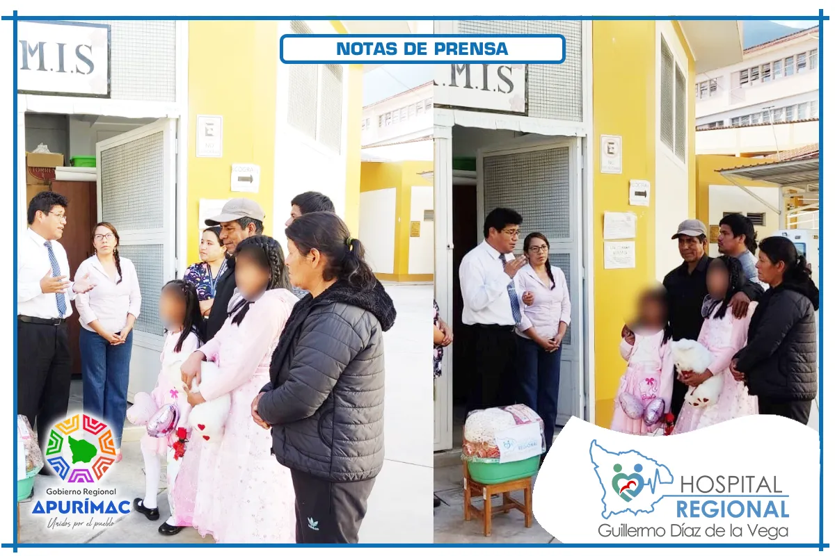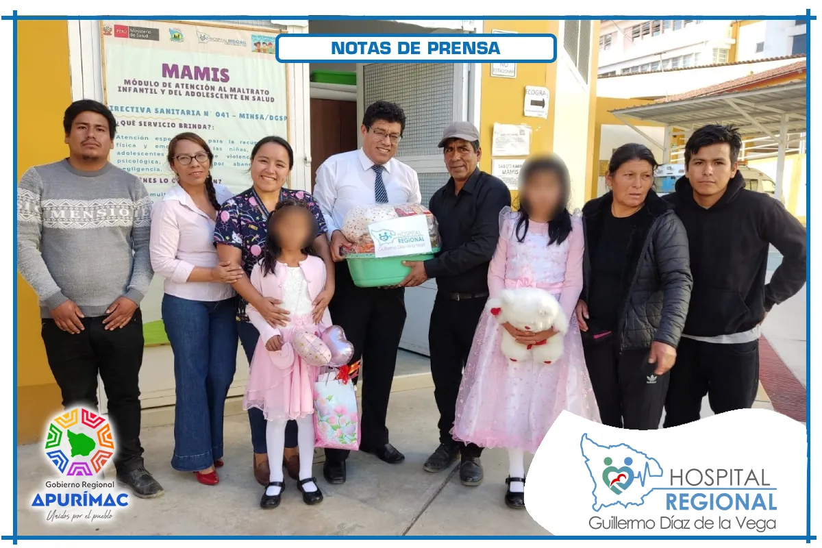 En un gesto de solidaridad y compromiso humano, el Magíster Joel Pimentel Marín, director del Hospital Regional Guillermo Díaz de la Vega de Abancay, realizó la entrega de una canasta de víveres a dos niñas que, tras superar una situación crítica de salud, fueron dadas de alta del servicio de pediatría del nosocomio regional.