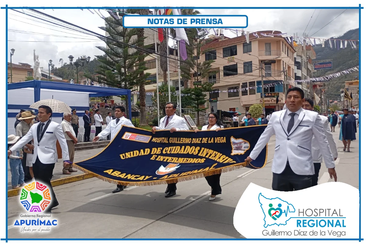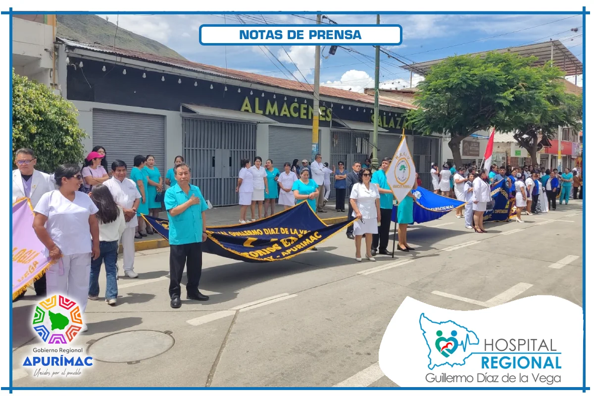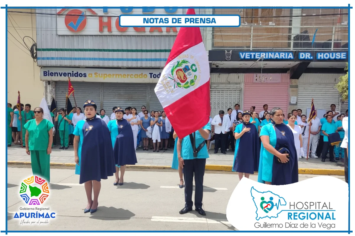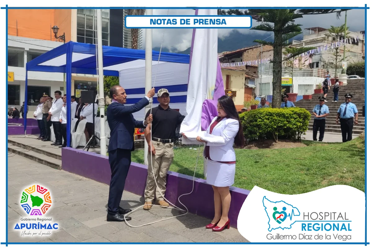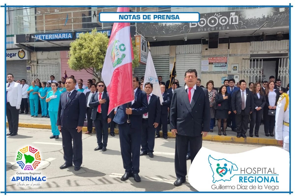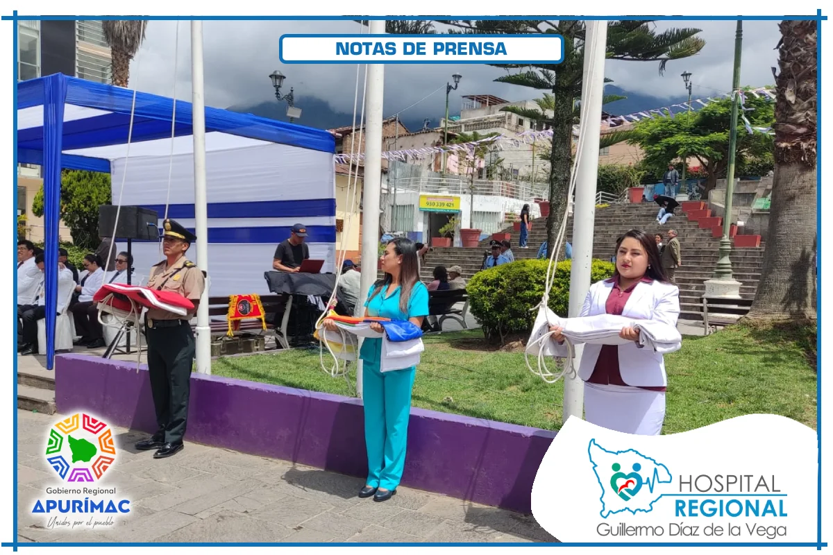 En el marco de las actividades oficiales por el 62.° aniversario de creación institucional, servidores del Hospital Regional Guillermo Díaz de la Vega de Abancay participaron el domingo 16 de noviembre en la ceremonia de izamiento del Pabellón Nacional, desarrollada en la Plaza Micaela Bastidas, reafirmando el compromiso de la institución con la salud de la población abanquina y apurimeña.